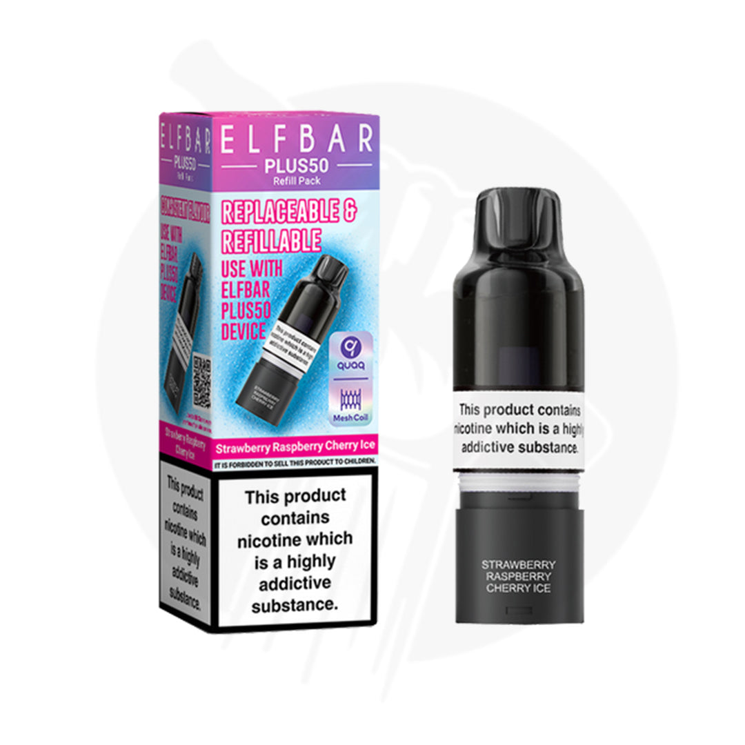 The Strawberry Raspberry Cherry Ice Elf Bar Plus 50 refill pack blends sweet strawberry, juicy raspberry, and rich cherry, finished with an icy cool exhale for a refreshing vape.
